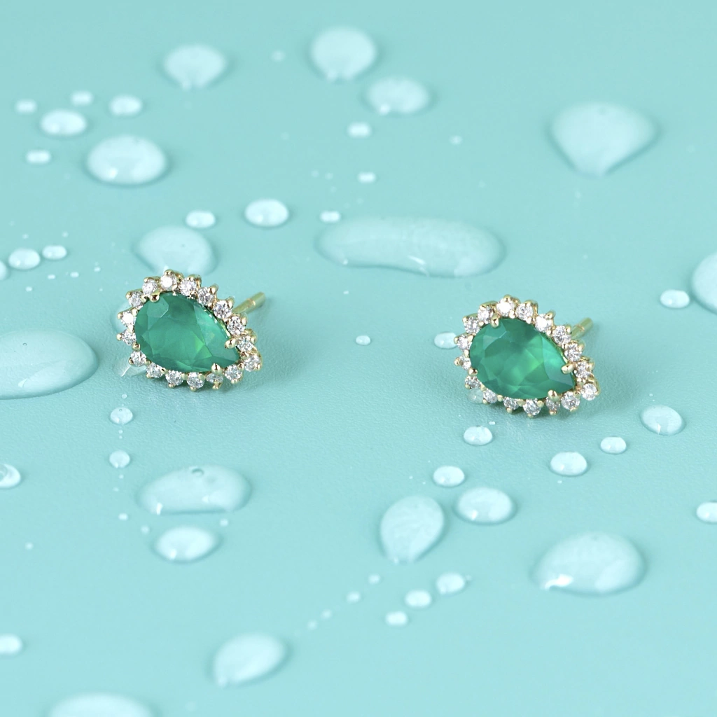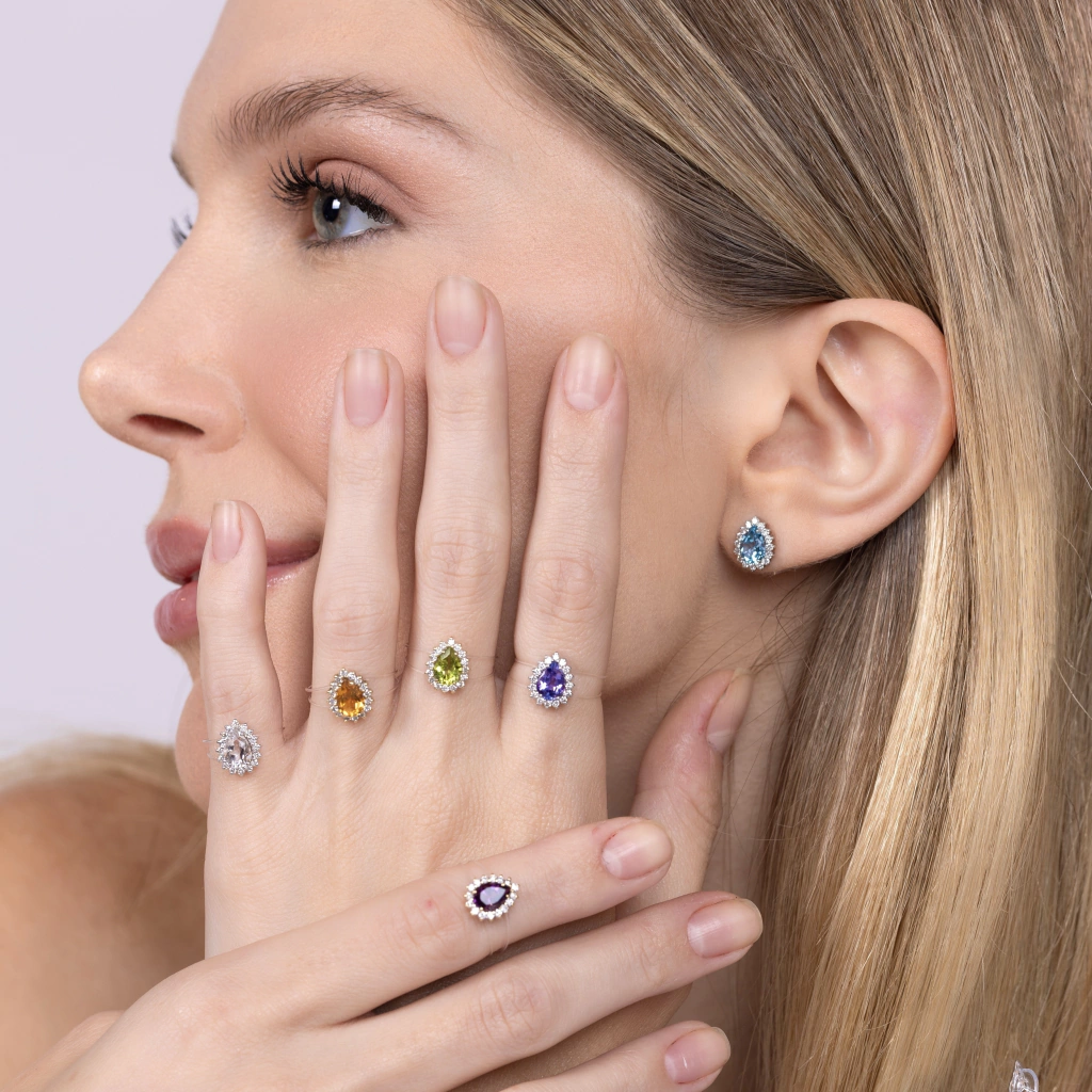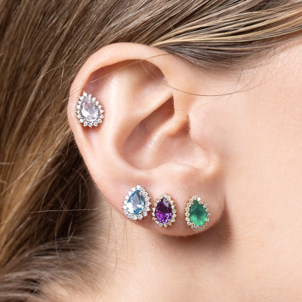 Descrição: Brinco com pedra central em lapidação gota e moldura em diamantes.