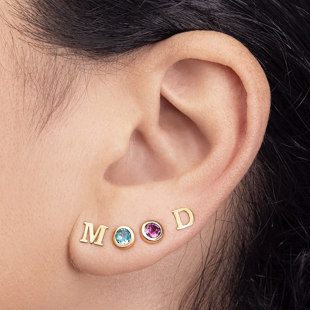 Piercing em formato de inicial. Esse modelo possui o sistema push-pin que oferece maior nível de conforto para a orelha recém furada, inclusive para dormir, além de proporcionar a cicatrização ideal do furo.