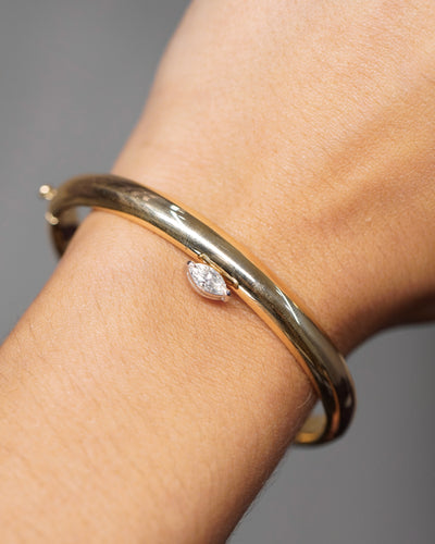 Anel solitário com diamante central navete, emoldurado por diamantes em cravação orgânica