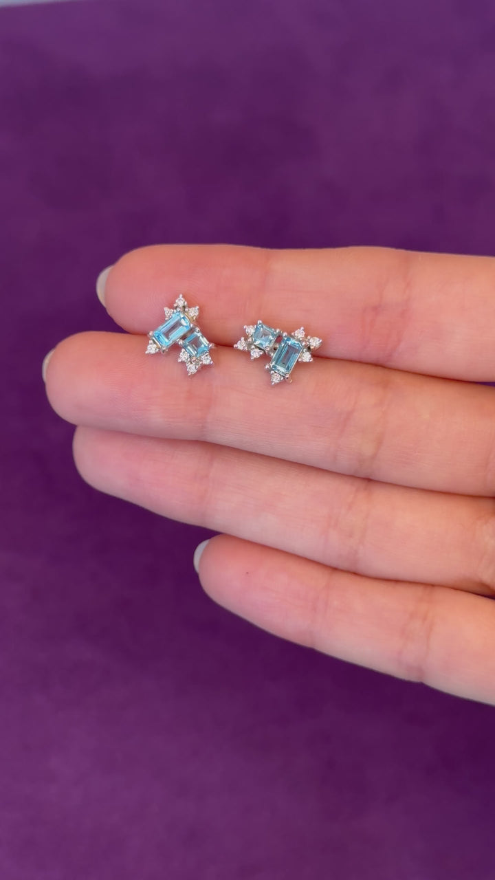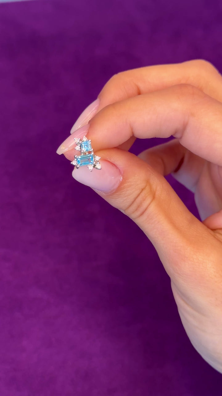 Brinco duplo em ouro 18K com baguetes de topázio azul em diferentes tamanhos e diamantes delicados. Uma joia exclusiva da leal, sofisticada e cheia de movimento.