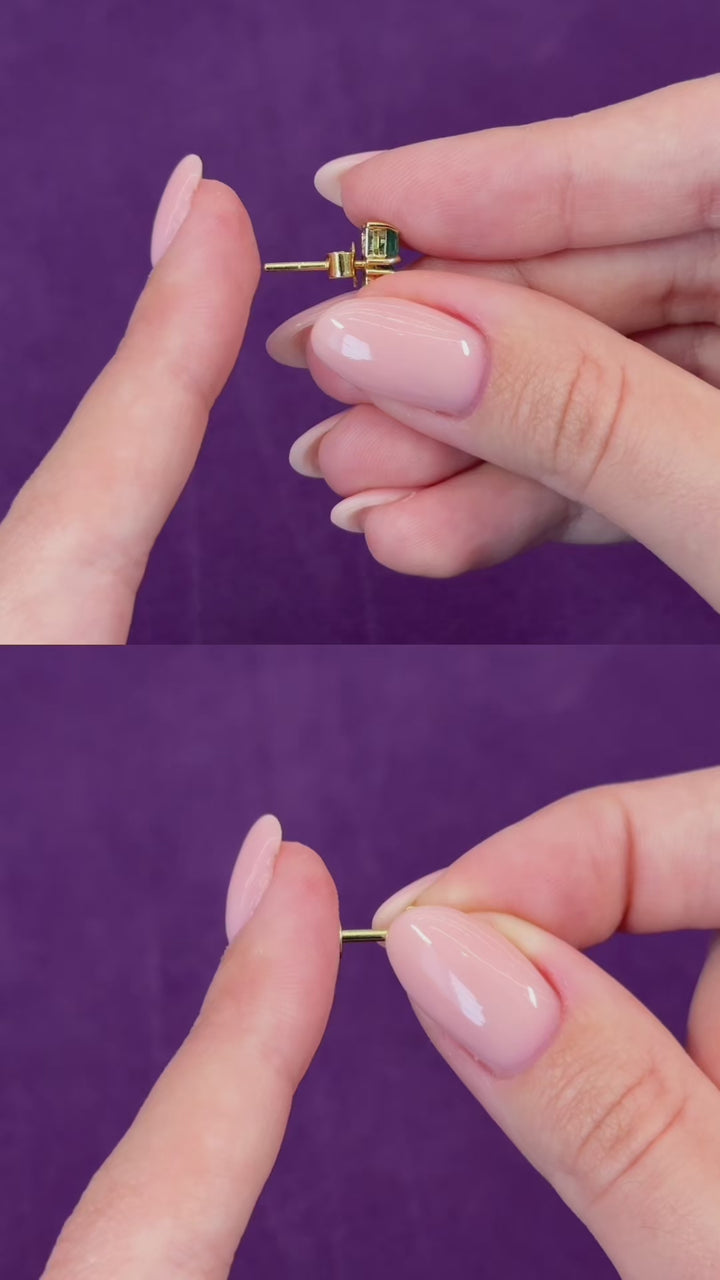 Brinco Duplo Esmeralda em ouro 18K com pedras naturais em lapidações gota e princess. Uma joia exclusiva da leal, elegante e versátil.