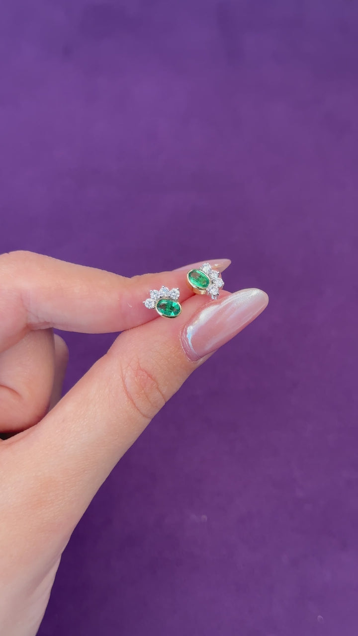 Brinco Oval Esmeralda e Diamante em ouro 18K, com pedra central em lapidação oval e moldura de diamantes. Uma joia exclusiva da leal, sofisticada e atemporal.