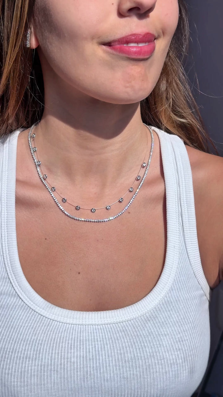 Design exclusivo da Leal, um verdadeiro ícone de desejo. Desenvolvido com fio de nylon especial, o mesmo usado na pesca de alto-mar, cria o efeito singular de pedras de topázio branco flutuando na pele. Sofisticado e atemporal, acompanha você em todos os momentos.