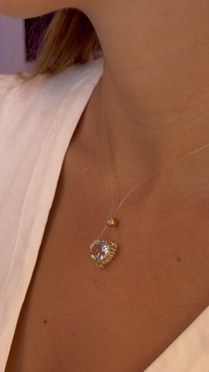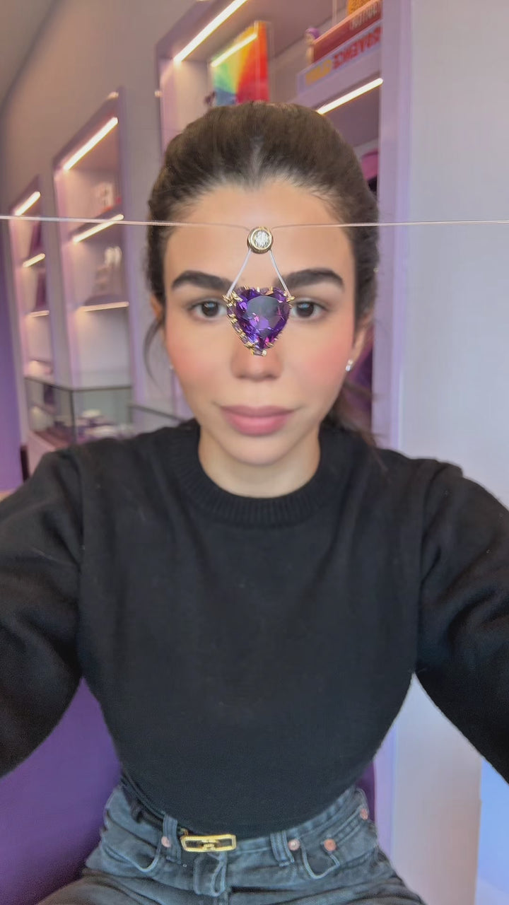 Colar gravata em fio de nylon especial e ouro 18k, com design exclusivo da Leal. Possui pingente central de diamante e coração em ametista, adornado por uma coroa lateral de ametistas cravejadas.