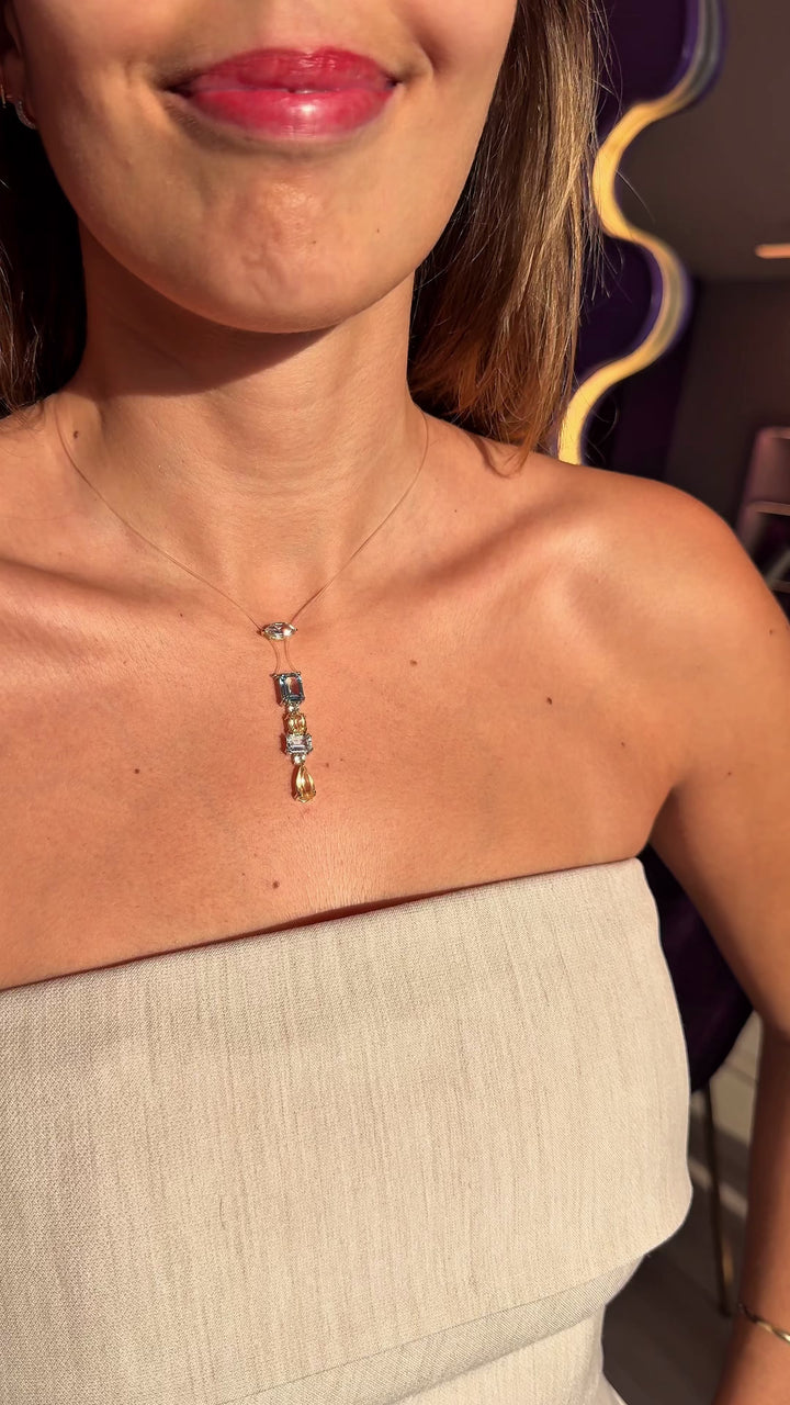 Colar gravata em fio de nylon especial e ouro 18k, com dois pingentes centrais — um topázio branco em lapidação navete e outro alongado com topázios e citrino em diferentes lapidações.